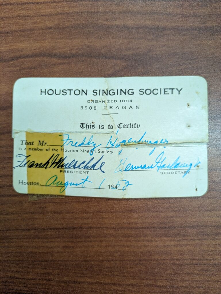 The Houston Saengerbund Records contains songbooks, events programs, ledgers, letters, treasury reports and other materials documenting the activities and administration of the organization from 1874 to 2013. Some of the highlighted materials of interest include a 1952 membership card belonging to a Mr. Freddy Hagenburger when the organization was still known as the Houston Singing Society and located at 3908 Feagan Street in Houston.